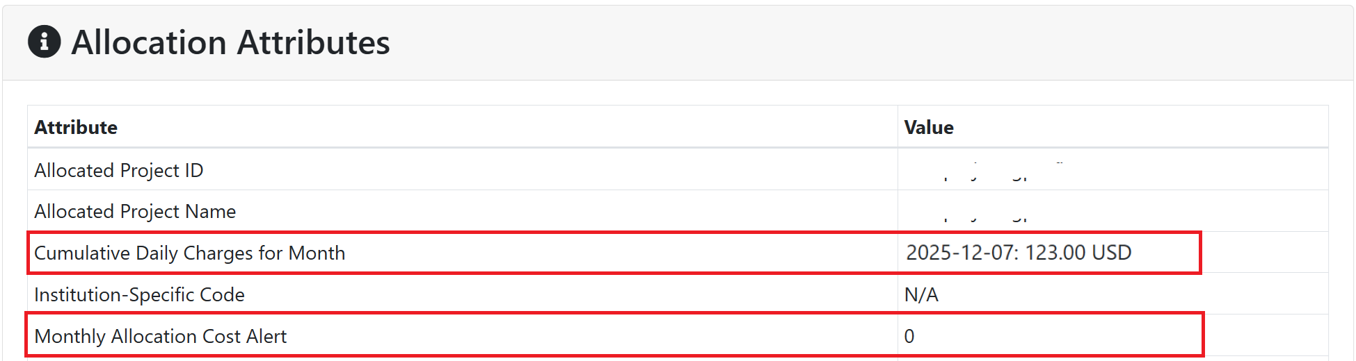 In addition, a new Allocation Attribute labeled Monthly Allocation Cost Alert is now available to provide automated cost alert notifications for Project PIs and Manager(s), as shown below: