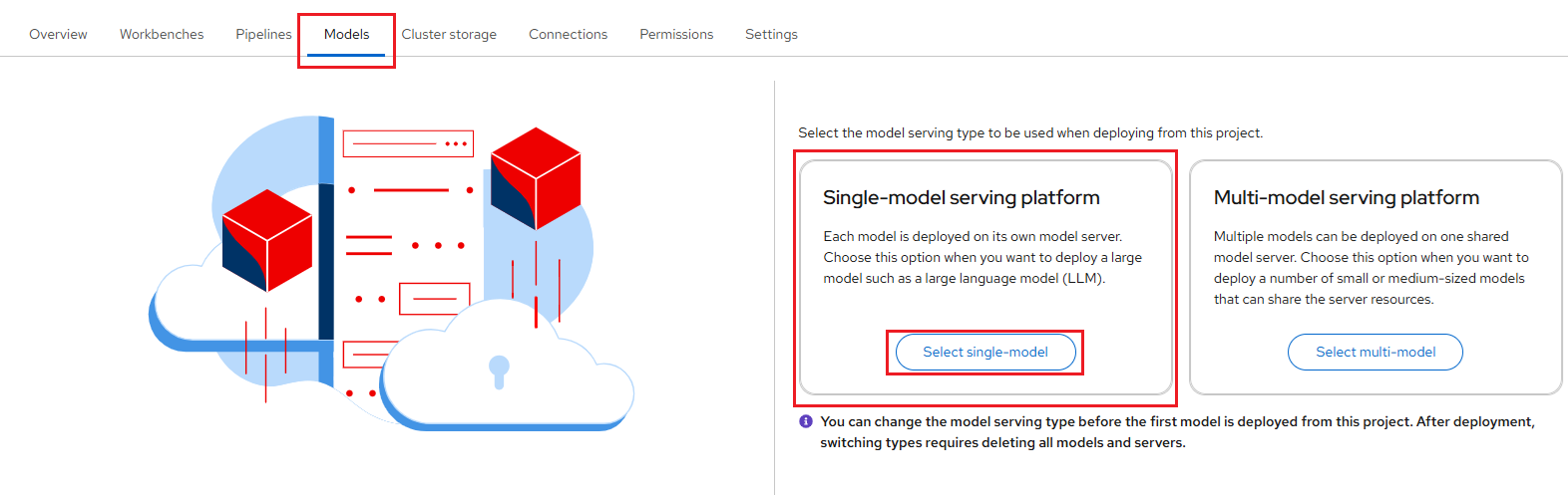 If you want to deploy each model on its own runtime server, or use a serverless deployment, select the Single-model serving platform. This option is recommended for production use.