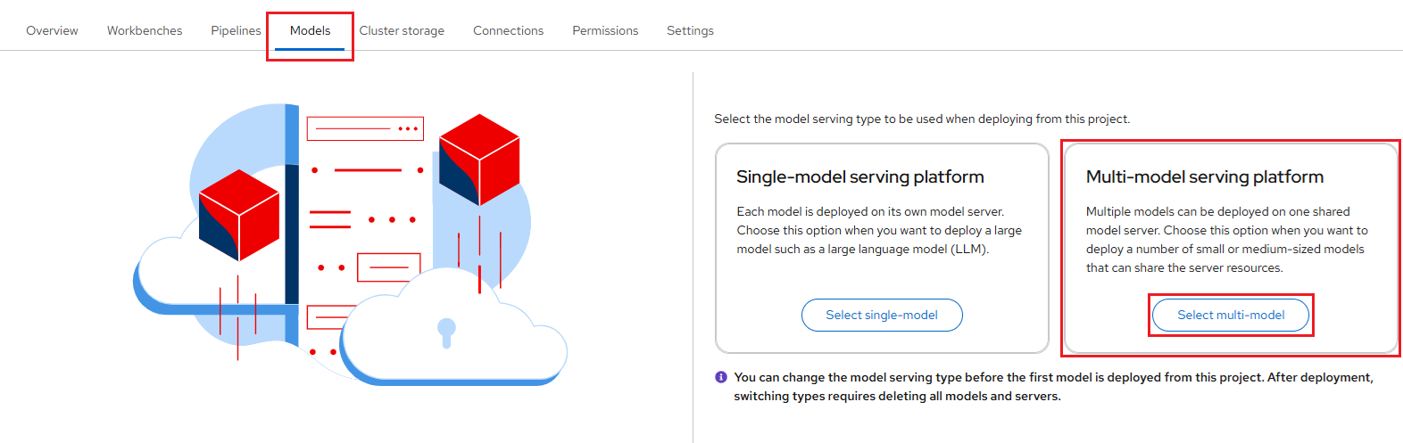 After creating the connection, you can add your model server. In the OpenShift AI dashboard, navigate to the data science project details page and click the Models tab. If this is the first time, then you will be able to choose the model serving type, either a Single-model serving platform or a Multi-model serving platform to be used when deploying from this project. The model-serving UI is integrated into the OpenShift AI dashboard and project workspaces, and cluster resources scale up or down with demand.