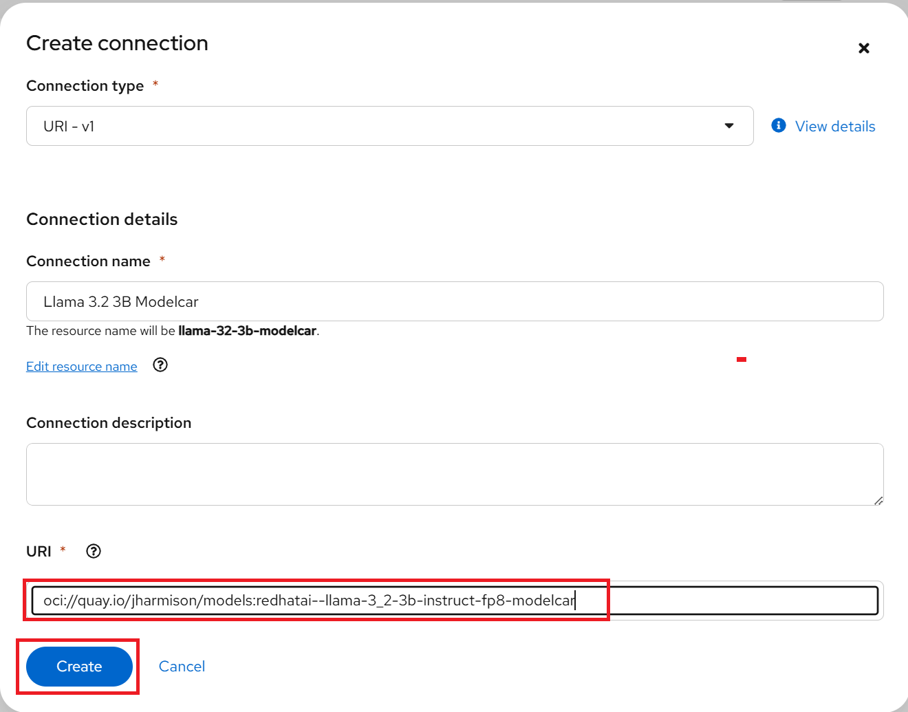 and use Llama 3.2 3B Modelcar as the connection name, as shown below: