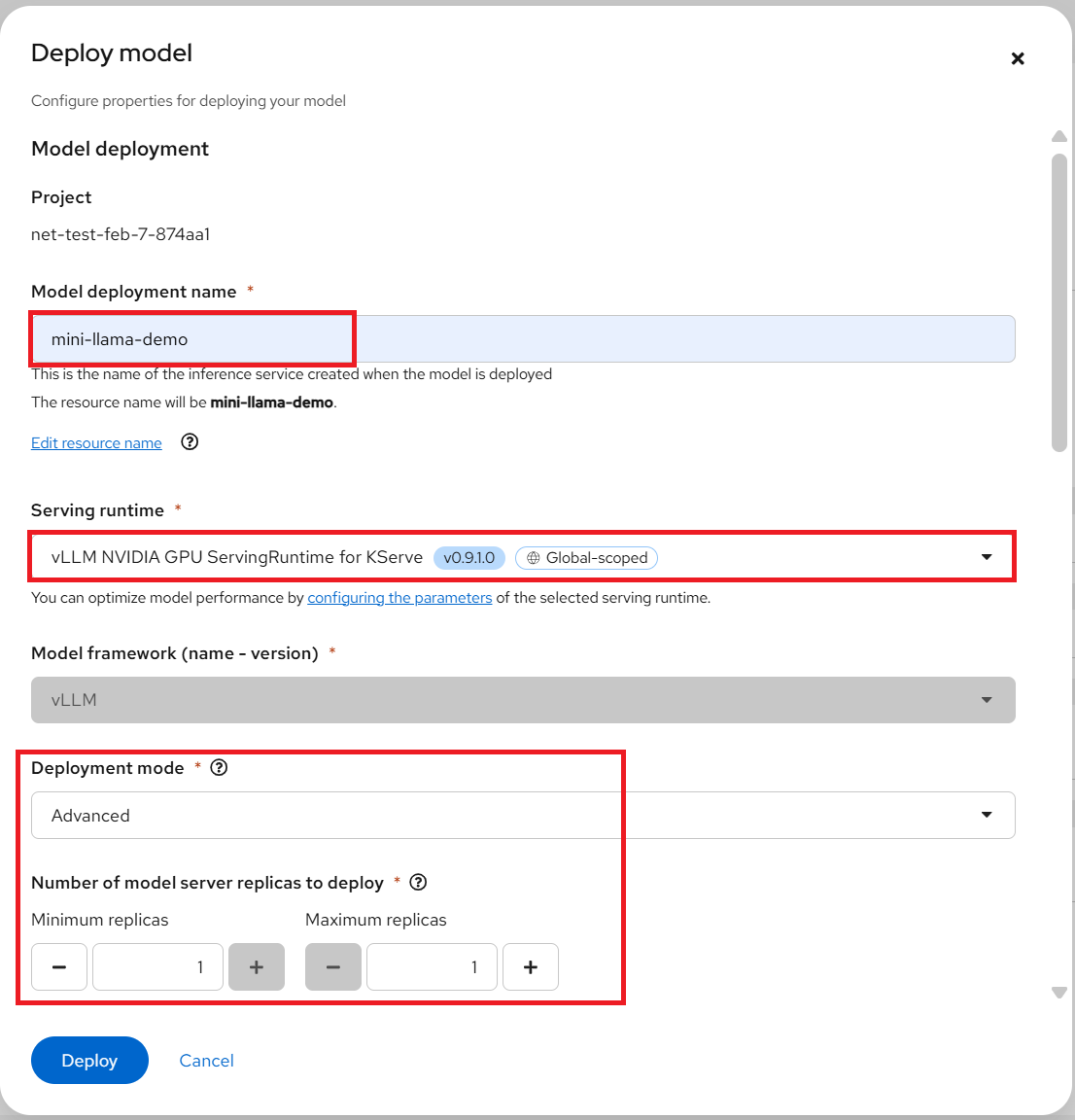 For our example, set the Model deployment name to mini-llama-demo, and select