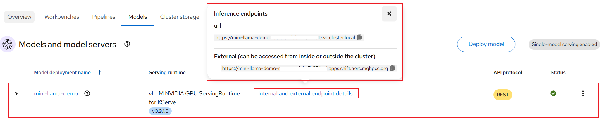 As in this example, you have exposed the model externally through a route, click on the "Internal and external endpoint details" link in the Inference endpoint section. A popup will display the address for the url and the External (can be accessed from inside or outside the cluster) for the inference endpoints as shown below: