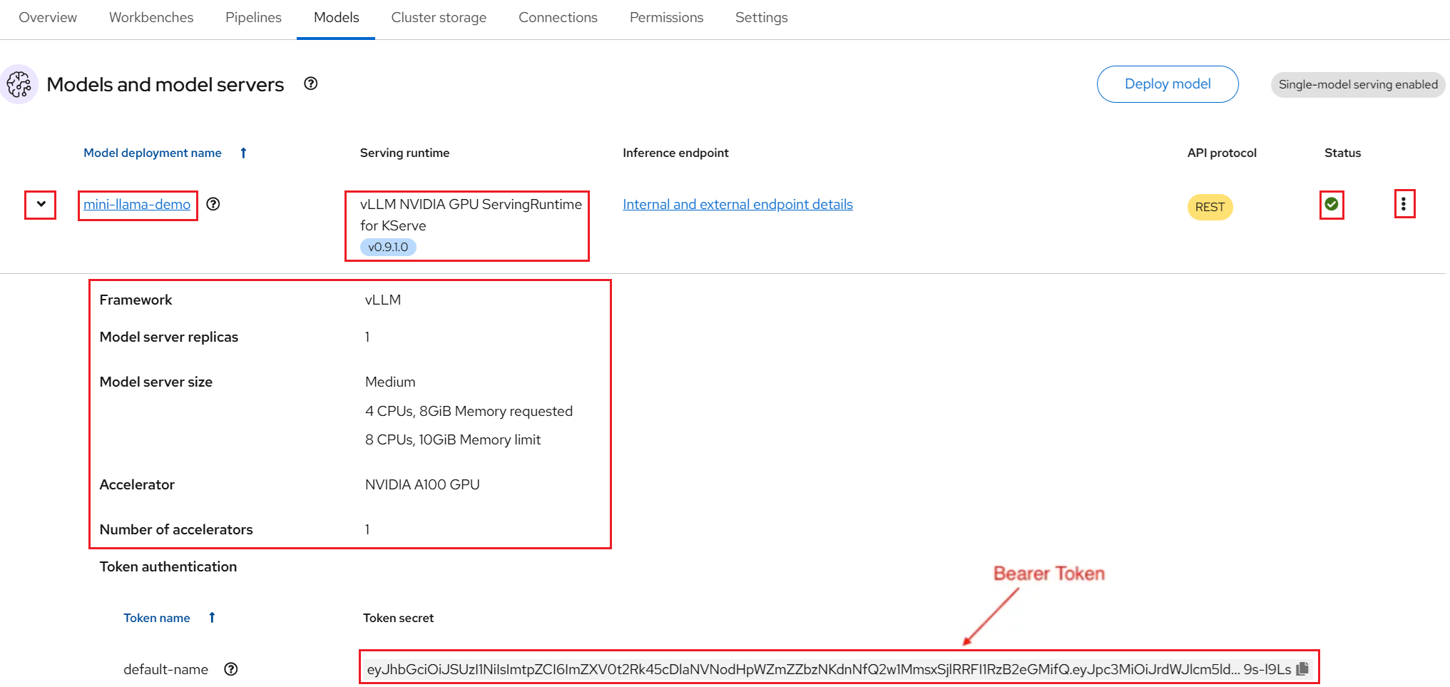 Confirm that the deployed model appears on the Models tab for your project. After some time, once the model has finished deploying, the model deployments page of the dashboard will display a green checkmark in the Status column, indicating that the deployment is complete.