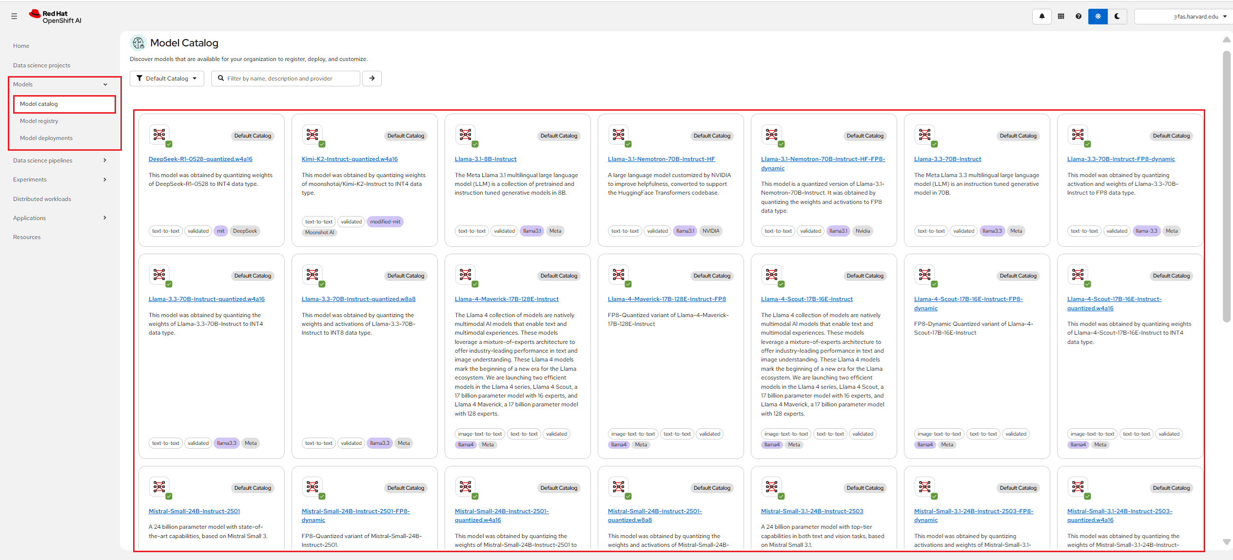 Recent version of RHOAI include support for the Model Catalog, enabling users to easily discover, evaluate, and deploy generative AI models from a centralized interface. This feature provides access to models from multiple providers such as Red Hat, IBM, Meta, NVIDIA, Mistral AI, and Google, with built-in benchmarking based on open-source evaluation datasets to compare performance and quality. It simplifies the workflow by allowing data scientists and AI engineers to select suitable models, register them in a model registry, and deploy them directly to a serving runtime.