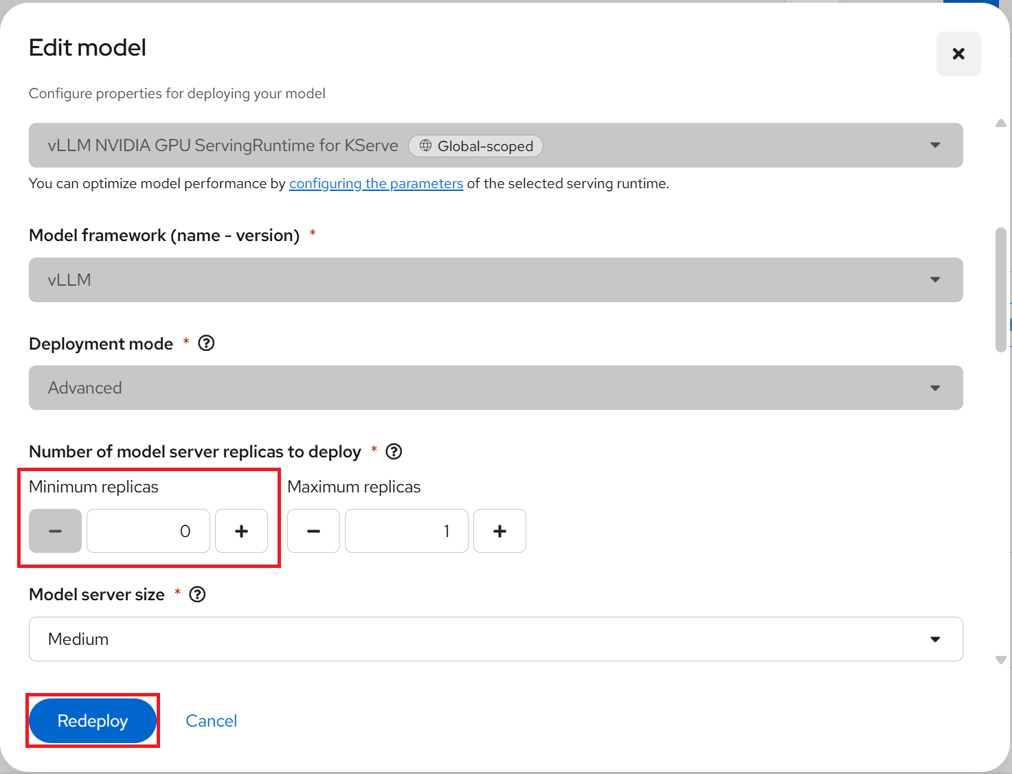 Once you have deployed your model and obtained the inference endpoints, you can modify the model configuration to set the Minimum replicas to 0, then redeploy it as shown below: