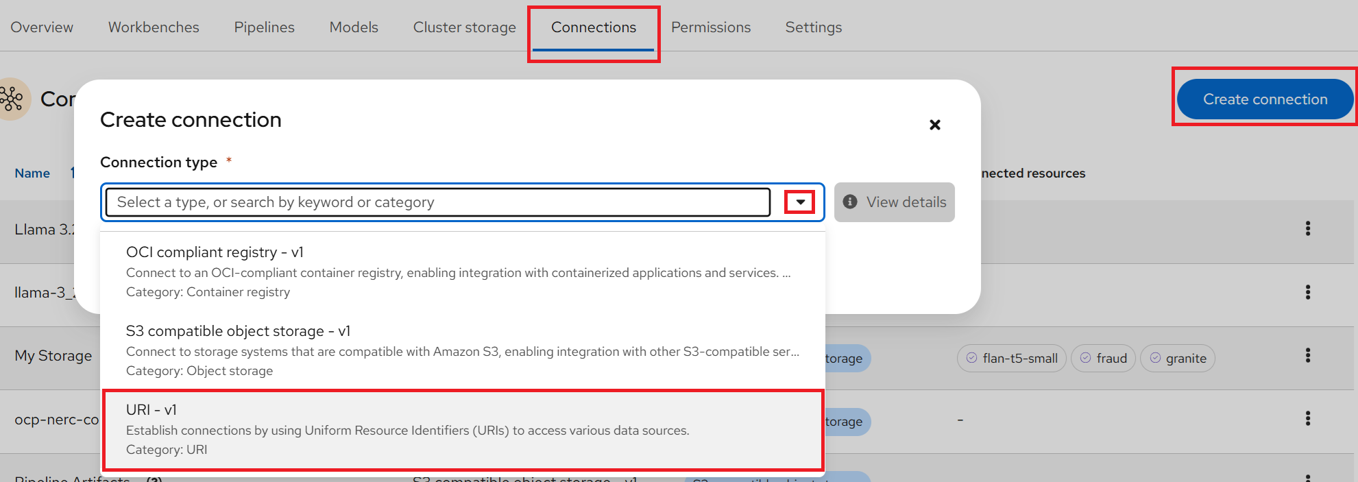 In your OpenShift AI project, go to the Connections tab and click the "Create Connection" and then choose the URI connection type as shown below:
