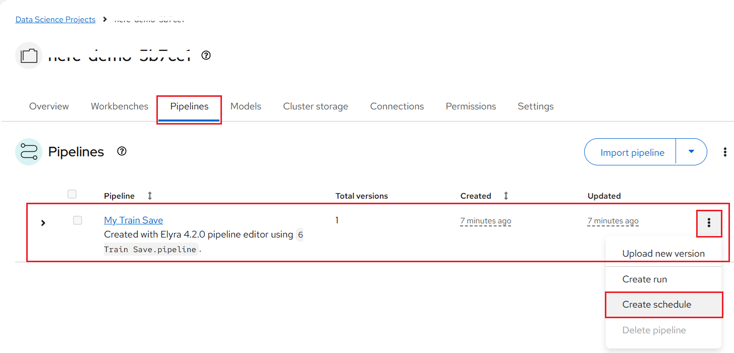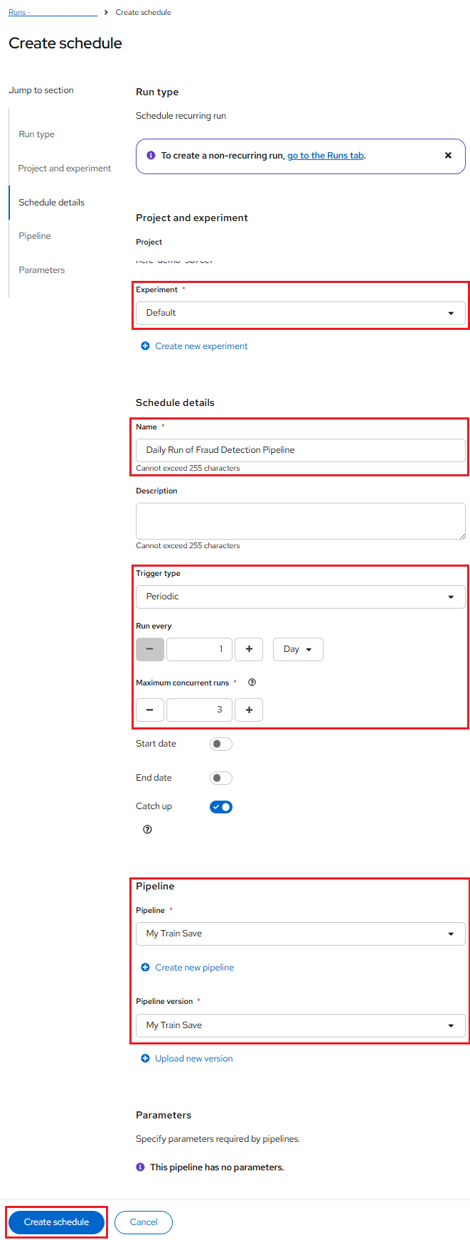 My Train SavePipeline and Version (The Pipeline's name we set while running the Pipeline for the first time)vi. and click Create schedule: