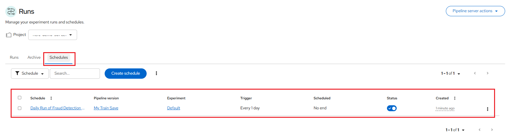 viii. In Data Science Pipelines -> Runs, click the Schedules tab to verify that the Scheduled run is visible, as shown below: