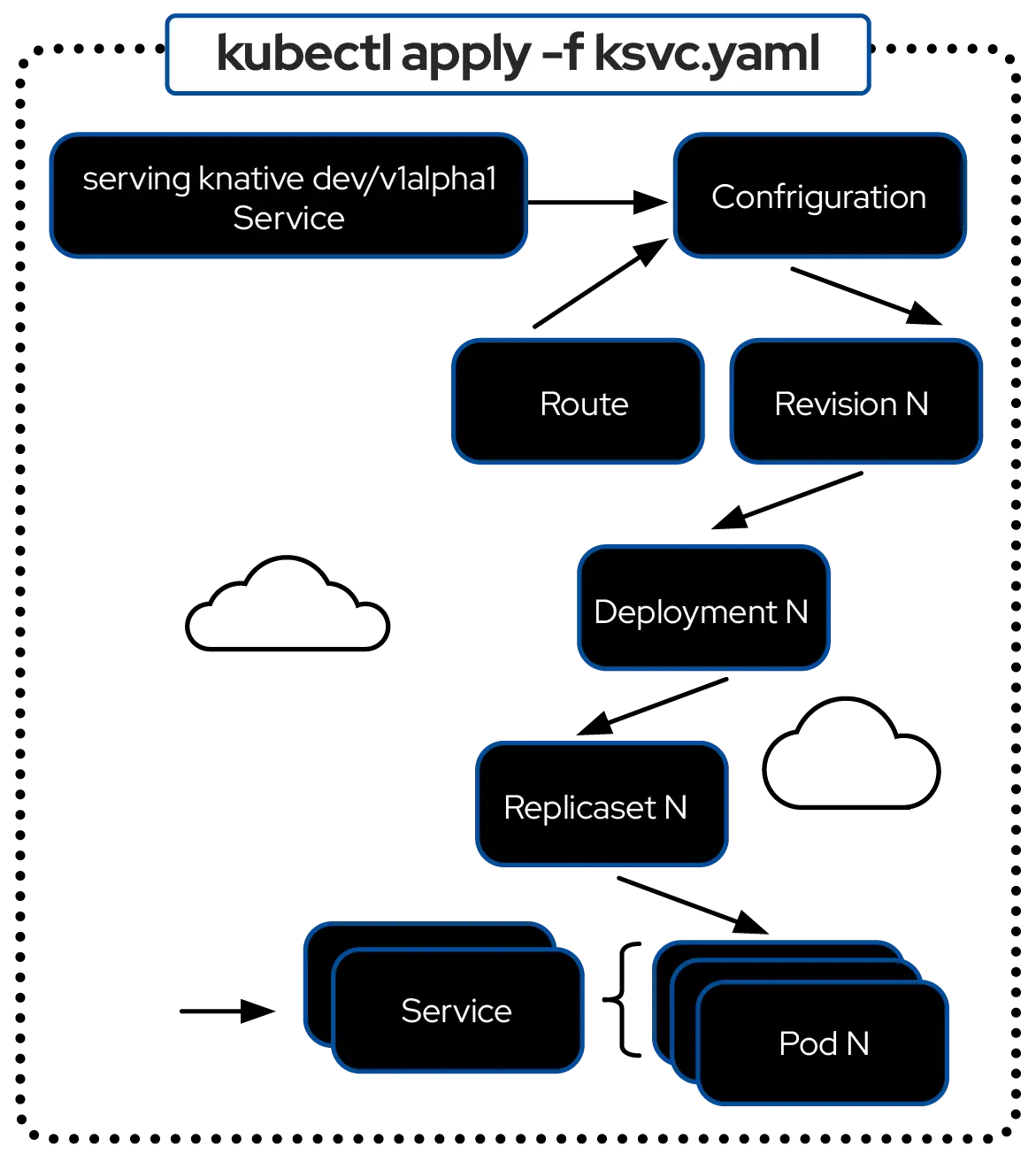 In Knative, deployment is even simpler: you define a small resource file called a Knative Service, which specifies the container image to run. When applied to the cluster, the Knative Operator automatically creates all necessary resources, including the deployment, service, route (if needed), and a configuration resource. The configuration resource also manages revisions, making it easy to roll back to previous versions when required.