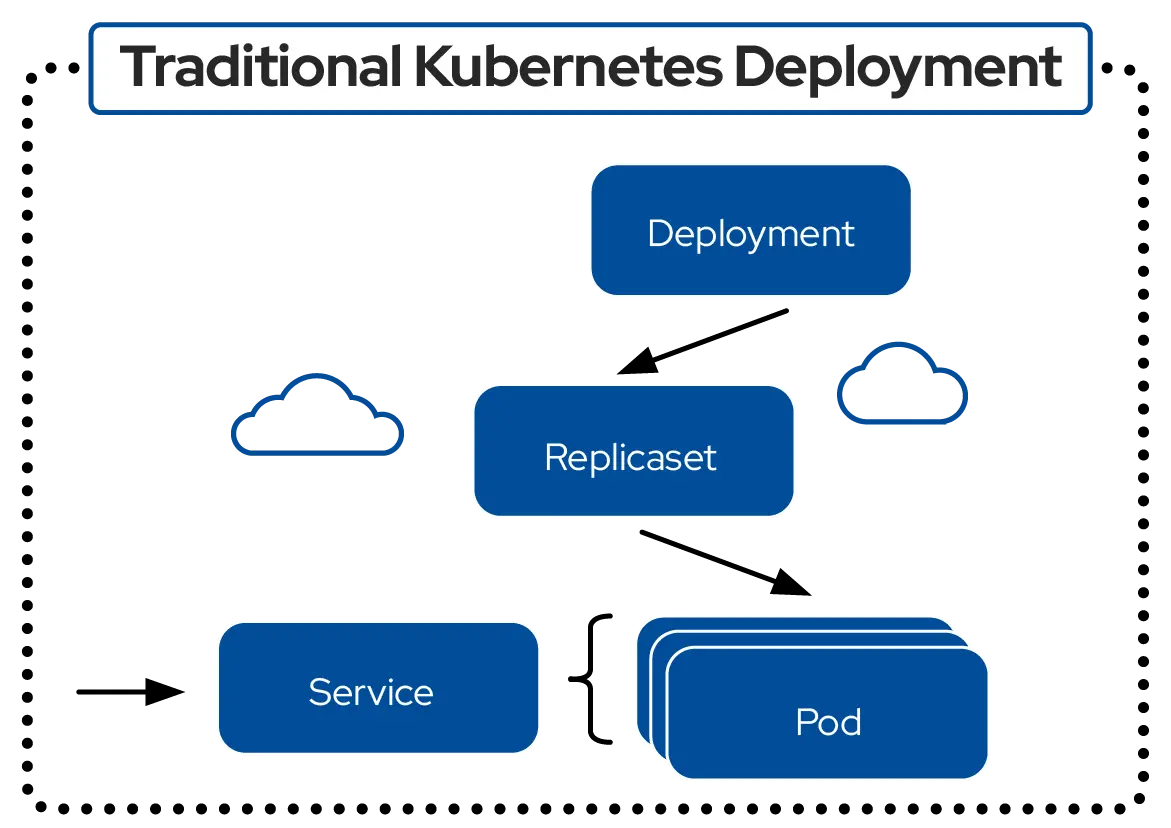 In a traditional Kubernetes deployment, a container image is hosted in a registry, and a YAML file defines the deployment. When applied to the cluster, the deployment creates a ReplicaSet, which then launches the specified number of pods. A service is also created to match the labels of these pods.