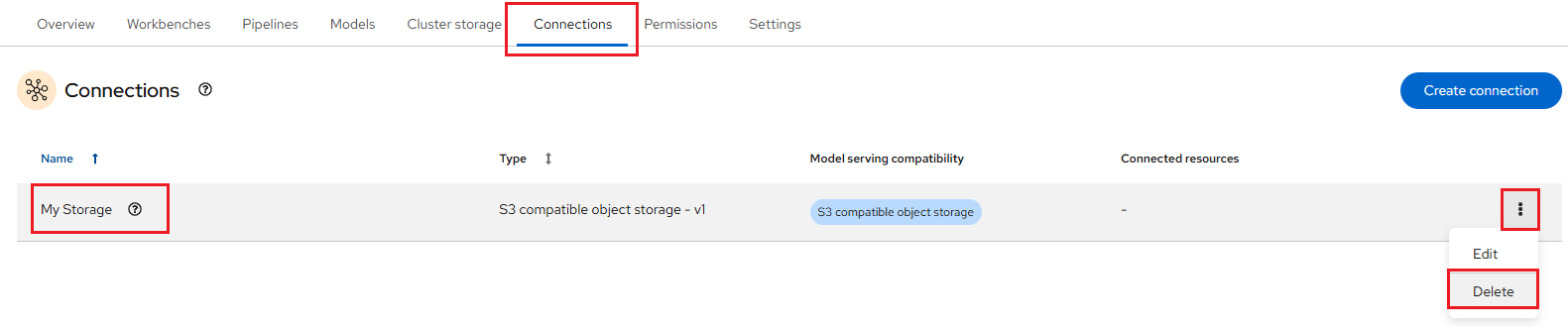 Delete all Connections by clicking on the three dots on the right side of the individual connection and selecting Delete connection, as shown below: