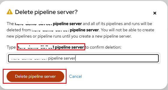 When prompted please confirm your pipeline server name and then click "Delete pipeline server" button, as shown below:
