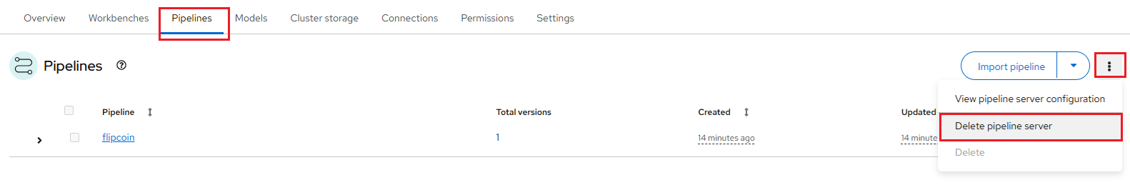 Delete all pipelines by clicking on the three dots on the right side of the Pipelines section and selecting Delete pipeline server, as shown below: