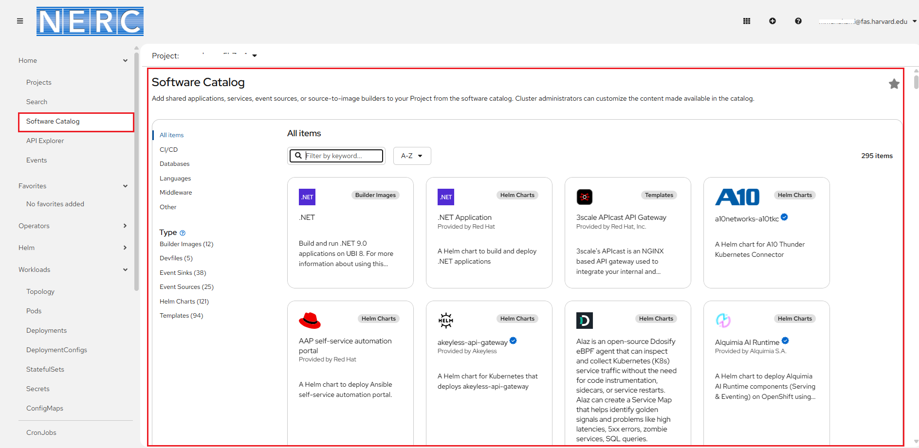 The NERC's OpenShift Container Platform (OCP) provides a web-based console that enables users to perform common management tasks such as building and deploying applications. It now features a single unified view within the OpenShift console, offering a more comprehensive and cohesive interface for all tasks. This enhancement simplifies navigation and allows developers and administrators to manage their environments seamlessly from one centralized dashboard.