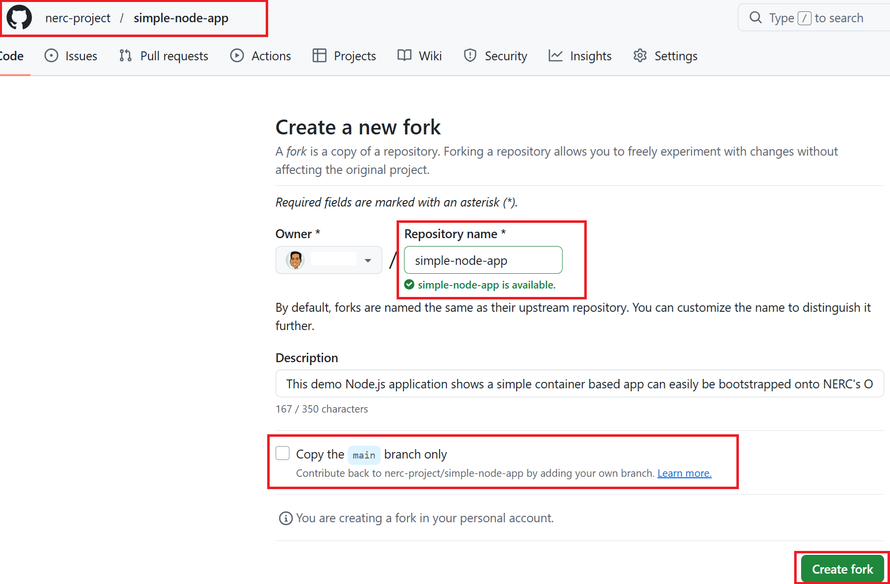 To create a fork of the example simple-node-app repository: