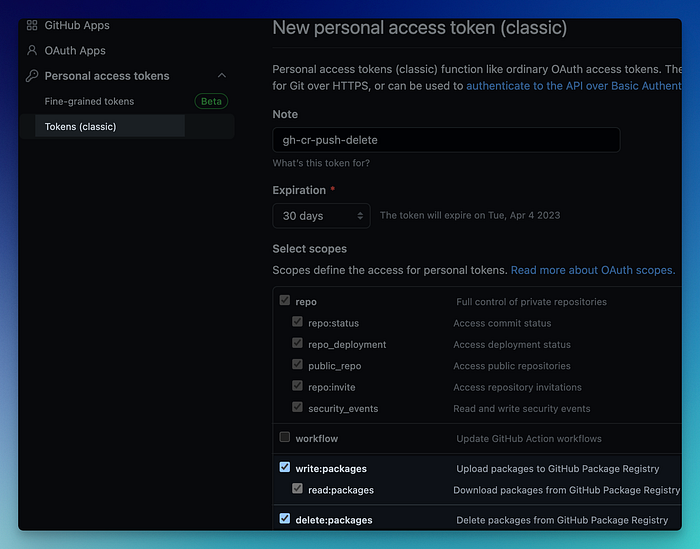 read:packagesscope with read/write and delete packages permission in your GitHub Settings.You can follow this documentation if you need instructions on how to do it.
