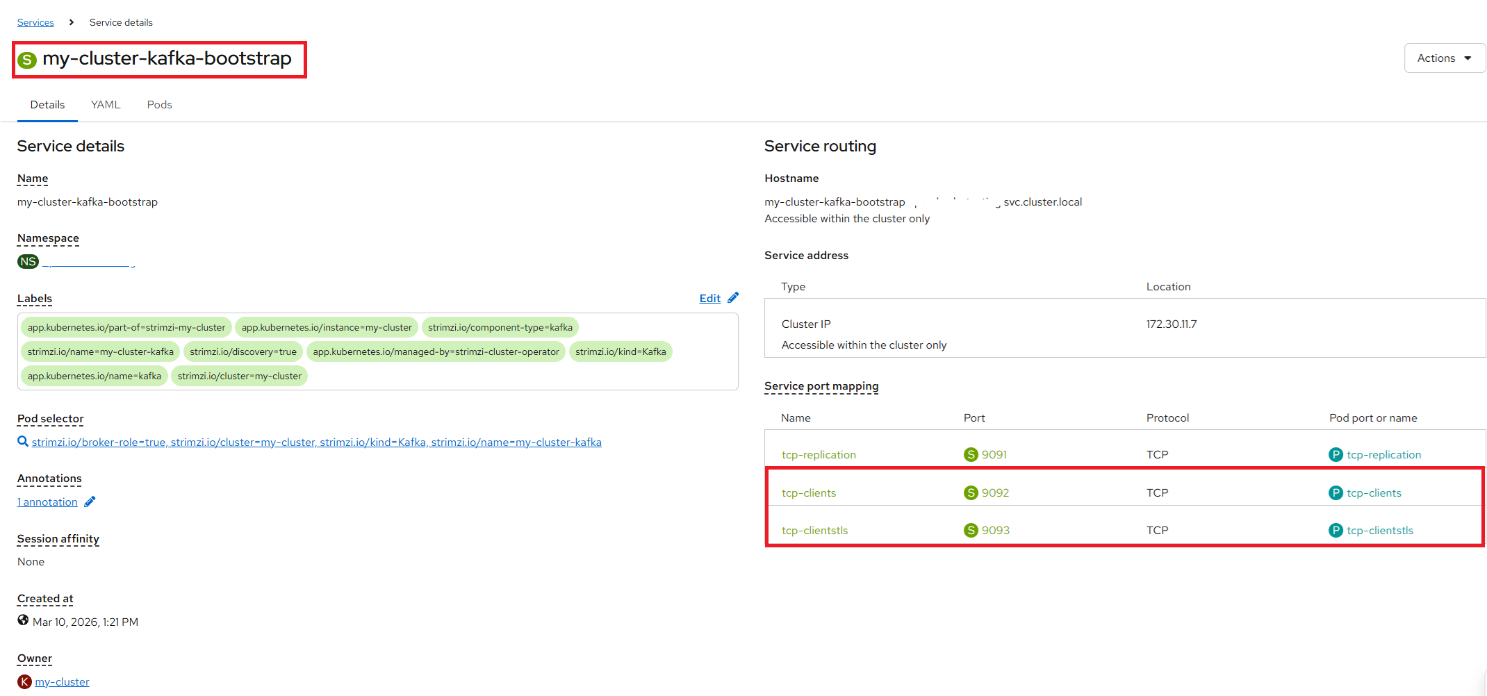 Applications running in the same OpenShift project can access the Kafka broker through the internal bootstrap service created during cluster setup, as shown below: